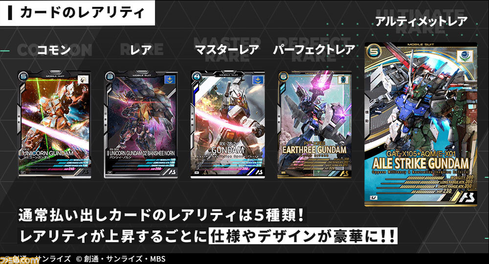 통상 지불 카드의 레어리티는 전 5종이 되어 있어 「커먼」, 「레어」, 「마스터 레어」, 「퍼펙트 레어」, 「얼티밋 레어」라고, 레어리티가 상승할 때마다 사양이나 디자인이 호화로워지고 갑니다.