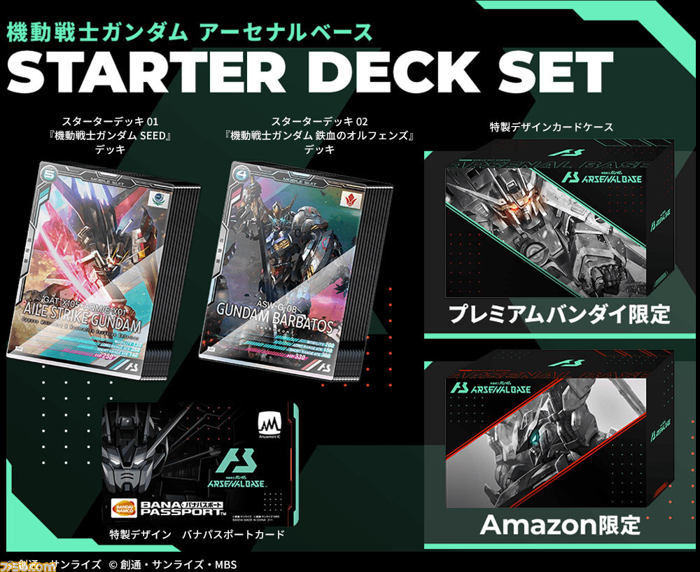 또, 오늘부터 프리미엄 반다이, Amazon.co.jp 한정으로, 「기동 전사 건담 SEED」/ 「기동 전사 건담 철혈의 오펜스」의 덱(카드 각 10장)이나, 오리지날 디자인의 특제 카드 케이스, 바나 패스포트 카드가 세트가 된 「기동전사 건담 아스날 베이스 스타터 덱 세트」(세금 포함 1,100엔)의 주문 접수를 개시했습니다.