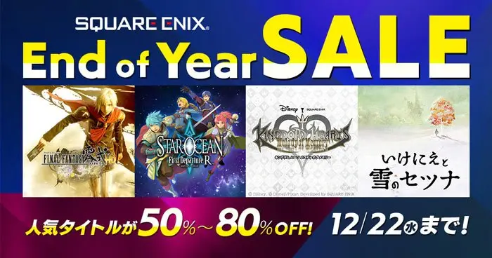 2021년 11월 29일(월)부터 12월 22일(수)까지 PlayStation Store&닌텐도 e숍에서 스퀘어 에닉스 작품을 최대 75%OFF 로 구입할 수 있는 「End of Year 세일」이 개최.