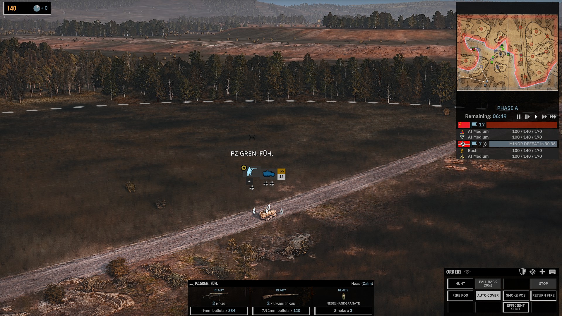 이것은 도움이 된다 - 당신의 기갑선과 기관단총의 범위를 빨리 보기 위해서. 주문 옆의 눈 아이콘 모양 사물을 다시 클릭하여 이 키를 끄십시오 - C 키를 누르십시오 - C 키는 장치를 클릭할 필요가 없는 지도 상의 모든 위치에 대한 조준 키 행입니다(마우스 포인터를 사용하여 C 키를 누름). 숲 한가운데에 있는 C 키를 누름). 120미터. 어쨌든 요점은 C 키를 눌러서 당신의 부대 위로 이동시킬 수 있다는 것이고 이것은 120미터가 얼마나 멀리 떨어져 있는지를 보여줄 것이다. 이것은 당신의 짧은 사거리의 무기가 얼마나 멀리 발사될 수 있는지를 기본적으로 이해시켜 줄 것이다. 이것이 기준점을 제공한다.