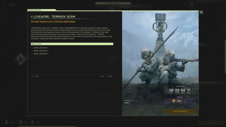 앞서 언급했듯이 New Prospect 메뉴를 확인하면 미션 트리가 표시됩니다. 각 위치에는 몇 가지 설정된 목표가 있지만 첫 번째 위치인 Beachhead: Recon은 쉬운 작업이 있으므로 자습서 역할을 합니다. 각 임무를 완료할 때마다 그에 연결된 임무가 잠금 해제됩니다.