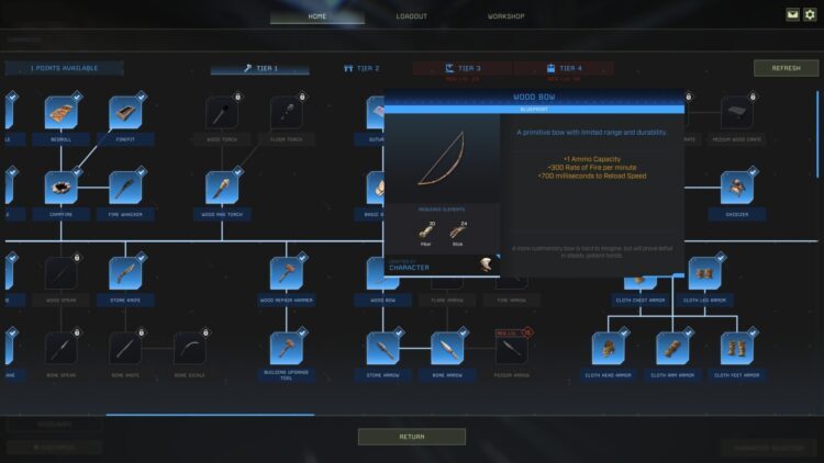 참고: 나중에 Tier 2에서 24x 나무, 32x 가죽 및 4x 뼈가 필요한 장궁을 잠금 해제할 수 있습니다.