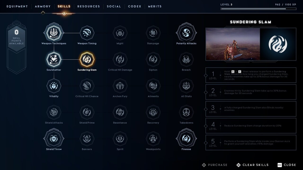 Godfall의 스킬 트리 능력의 다섯 별 다섯 그리드입니다. 각 코너에서 시작하여 학습한 각 스킬 포인트로 그리드를 통과할 수 있습니다. 각 스킬에는 5가지 레벨이 있습니다. 트리에서 더 투자하고 싶은 스킬을 찾으면 레벨 5까지 레벨을 올릴 수 있습니다. Sundering Slam과 같은 스킬은 강력한 단일 스킬입니다. 하지만 레벨이 올라갈수록 더 강력해지거나 실명과 같은 상태이상을 일으킬 수 있습니다.