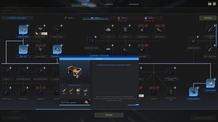 Tier 2 물건에 대해 말하면 8x 섬유, 8x 막대기, 24x 돌 및 4x 철 주괴가 필요한 요리 스테이션을 만들 수도 있습니다. 다음과 같은 추가 레시피가 있습니다.