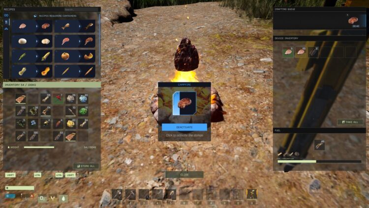다음으로 캠프파이어를 만들고 싶을 것입니다. 그것은 8x 섬유, 8x 막대기 및 24x 돌이 필요하며 시작 지역에 종종 풍부합니다. 일단 제작되면 나무, 섬유 또는 막대기와 같은 연료를 추가해야 합니다. 요리하고 싶은 날 음식을 선택하면 몇 초 후에 장치 인벤토리의 슬롯에 나타납니다. 여기 몇 가지 예가 있어요.