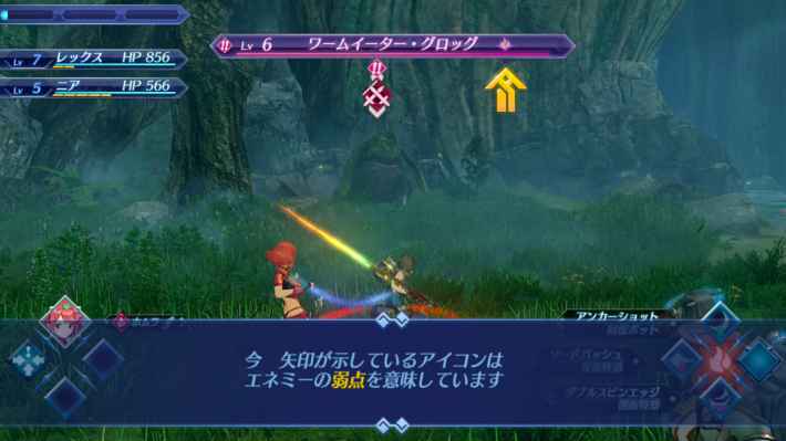 적의 HP 게이지에는 약점 속성이 아이콘으로 표시되어 있다 . 앞으로 많은 블레이드와 만나 약점 속성으로 공격할 수 있게 된다.