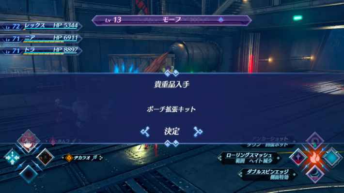 모프를 이기면 파우치 확장 키트를 얻을 수 있다. 캐릭터 파우치 세트 화면에서 X 버튼으로 확장하여 향후 전투를 유리하게 진행합시다.