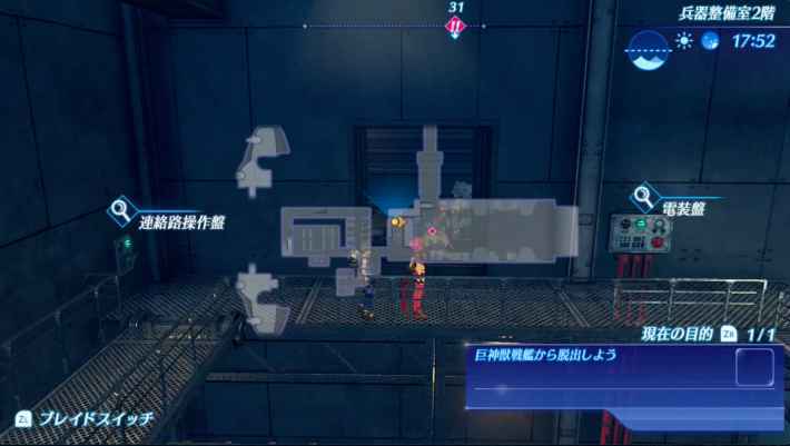▲ 오른쪽 전장판을 조사하면 격납고에 들어갈 수 있다. 또한, 왼쪽의 연락로 조작반을 조사하면, 아래로 내리는 통로를 할 수 있다.