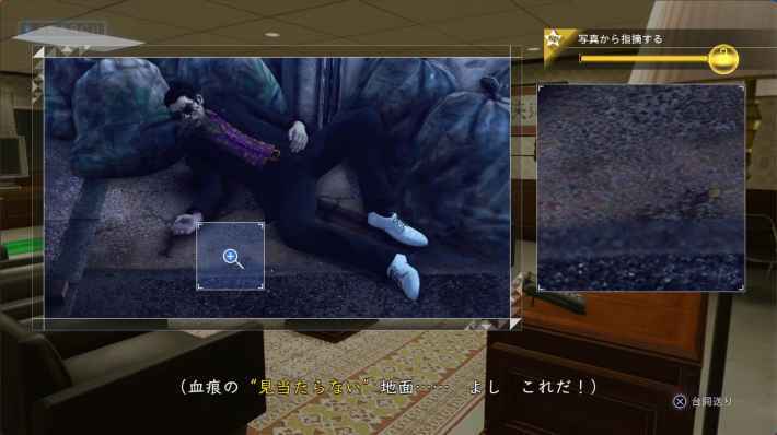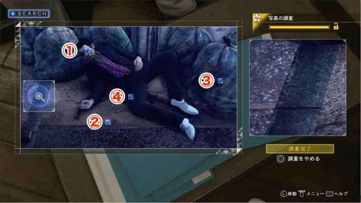 증거품 등을 조사하는 '빠른 검색 모드'로 현장 사진을 조사하자. 어디를 조사하면 좋은지는 대사가 힌트가 되고 있다. 이번은 4곳 조사하면 OK.