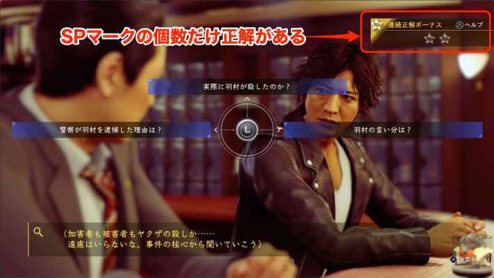 차례로 질문하여 SP를 획득하자. 3개의 질문한 뒤, 「경찰의 움직임에 대해」는 (들)물어도 듣지 않아도 어느 쪽이라도 좋다.