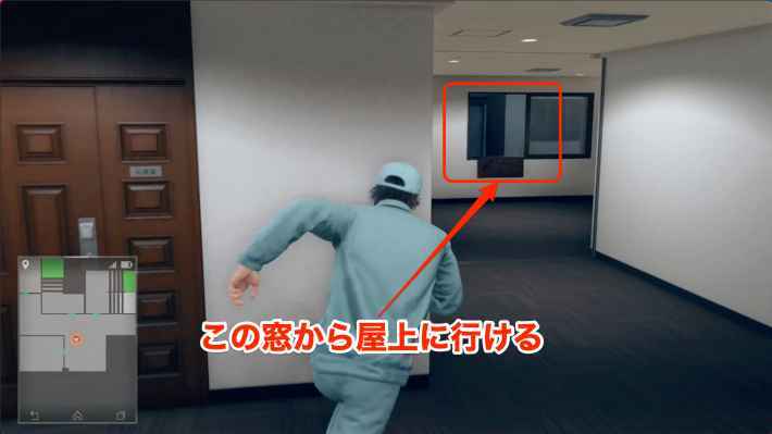 어느 문에서도 앞으로 나아갈 수는 없지만, 창으로부터 옥상으로 나오는 것이 가능. 아이템을 잡으면 옥상으로 가자.