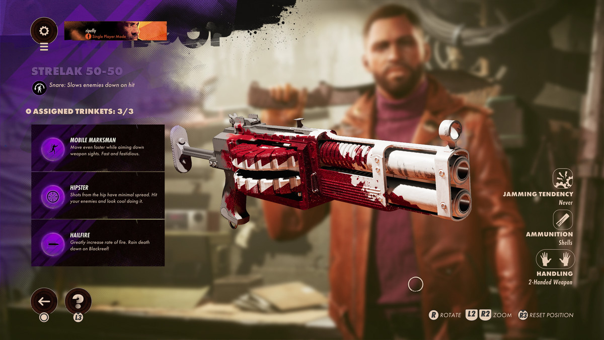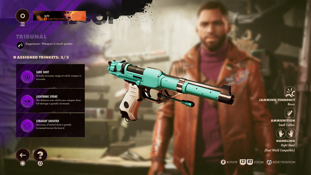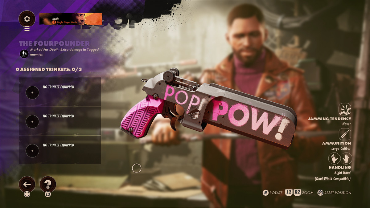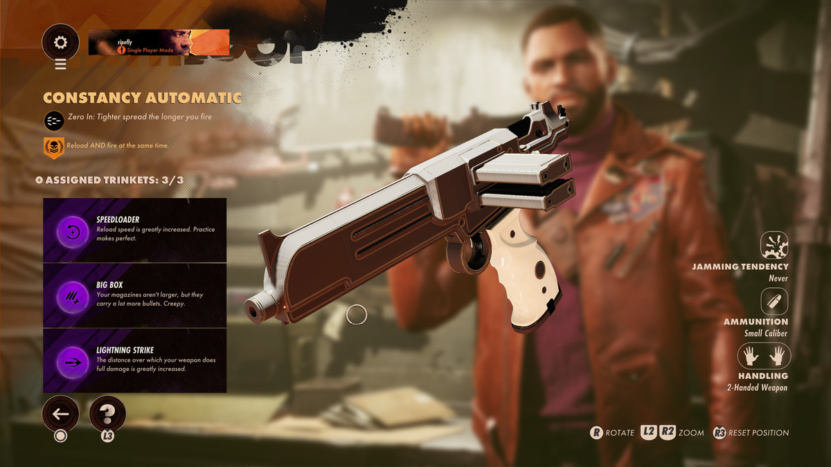 장신구 : Speedloader (재장전 속도 증가), Big Box (탄창 크기 증가), Lightning Strike (전체 피해 범위 증가)