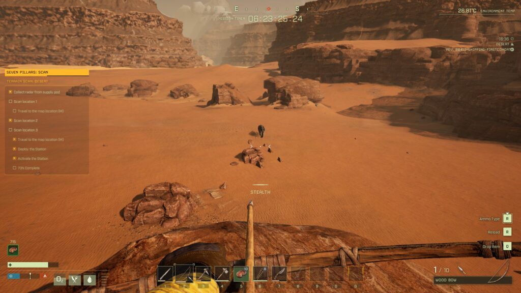 고기가 익는 동안 Oxite 침전물을 찾아 산소 측정기를 다시 채우십시오.그런 다음 지도를 열고 C-14의 목표 마커에 새 웨이포인트를 설정합니다.떠나기 전에 마지막으로 물을 한 모금 마신 다음 동쪽으로 향합니다.조금 있다가 남쪽으로 가면 곧 다음 스캔 구역이 나옵니다.평소와 같이 레이더를 설정하고 활성화한 다음 상당한 거리를 이동합니다.