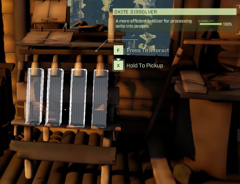 산소를 제공하는 일부 개체는 캐릭터 인벤토리의 O 2 미터 옆에 있는 슬롯에 놓을 수 있습니다 . 이 슬롯의 산소 항목은 고갈될 때까지 자동으로 O 2를 제공합니다 .