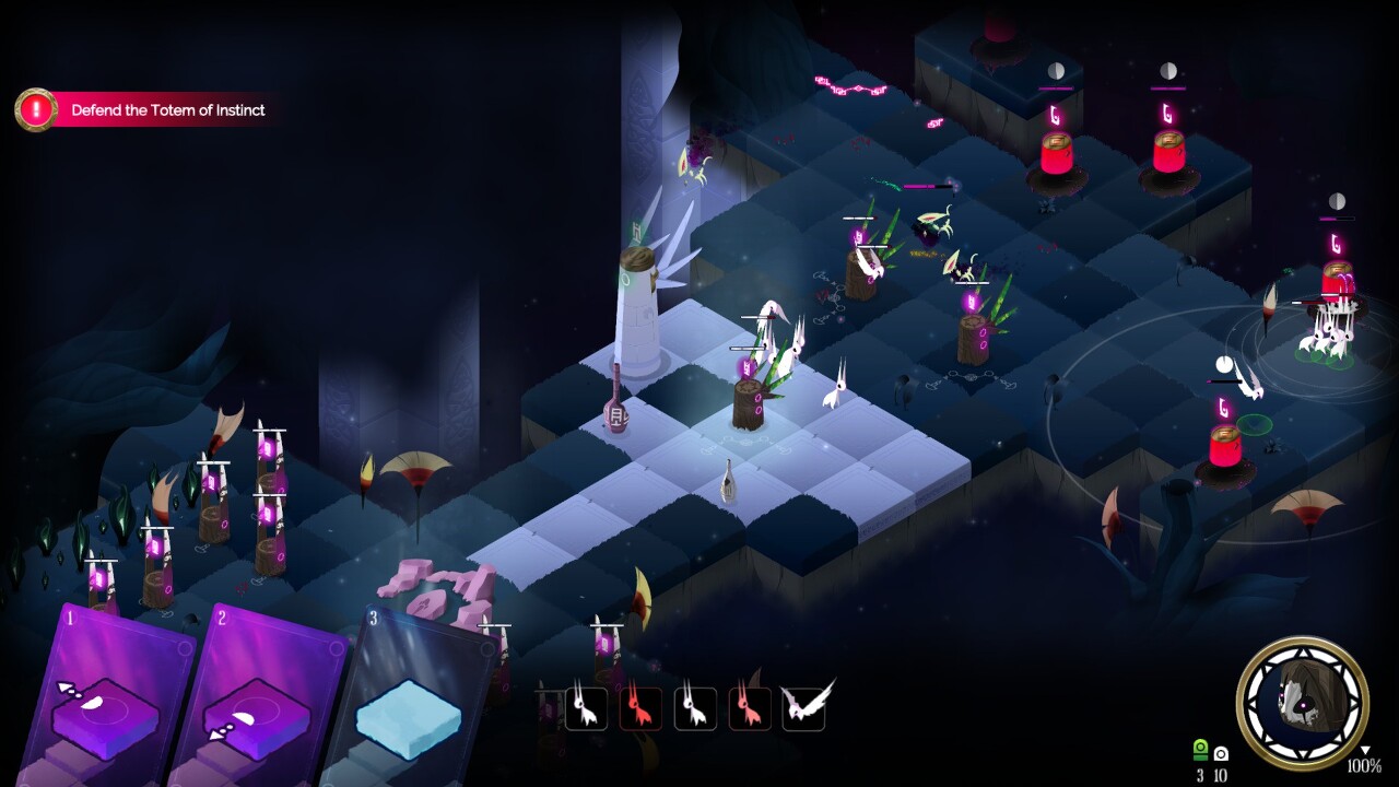 에너지 흐름에 따라 타일을 결합하면(방향 화살표로 표시됨) 토끼와 새와 같은 작은 영적 생물로 표시되는 유닛을 생성하는 토템이 생성됩니다.