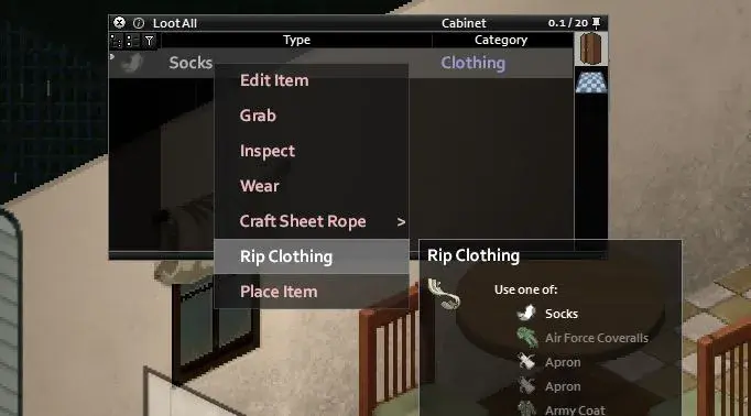붕대(찢어진 시트)를 만들려면 적합한 옷을 찢기만 하면 됩니다. 천으로 만든 것은 무엇이든 찢어서 붕대로 사용할 수 있습니다. 먼저, 주변에 널려 있는 여분의 옷을 줍습니다. 인벤토리의 항목을 마우스 오른쪽 버튼으로 클릭하여 추가 작업을 볼 수 있습니다. 이제 Rip Clothing 이라는 옵션을 선택하려고 합니다 . 그런 다음 옷을 부수고 찢어진 시트를 얻습니다.