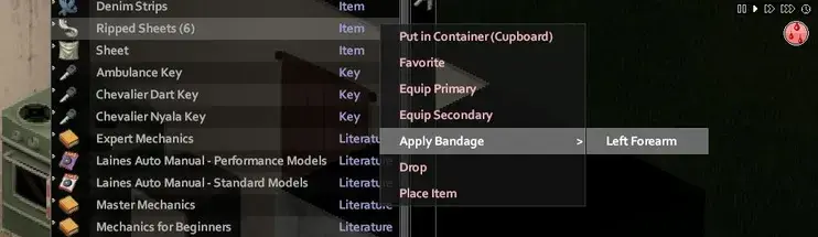 - 인벤토리에서 찢어진 시트를 마우스 오른쪽 버튼으로 클릭하고 붕대 적용 옵션을 선택합니다 . 그런 다음 붕대를 적용할 신체 부위를 선택할 수 있습니다.