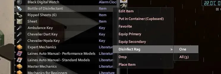 붕대를 소독하려면 인벤토리를 열고 소독하려는 찢어진 시트나 소독제 병을 마우스 오른쪽 버튼으로 클릭하면 됩니다. 소독제를 선택하면 여러 개의 걸레를 한 번에 소독할 수 있습니다. 붕대는 일단 소독하면 더러워질 때까지 소독된 상태를 유지합니다. 걱정 마세요. 소독된 상태를 유지하는 시간에는 제한이 없습니다.