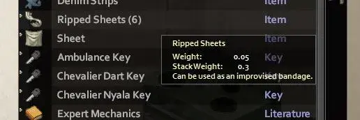 물렸을 때 가장 먼저 깨달을 것 중 하나는 부상을 빨리 치료해야 한다는 것입니다. 부상을 빨리 극복할수록 감염될 가능성이 줄어들고 생존 가능성이 높아집니다. 붕대로 사용하기 위해 제작할 항목은 Ripped Sheet 입니다. 이 찢어진 시트를 임시 붕대로 사용할 수 있습니다. 더 빨리 치유하는 데 도움이 되도록 게임에서 찾을 수 있는 실제 붕대 도 있지만, 우리는 그것들을 전혀 만들 수 있습니다.