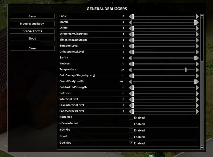 이 기호는 Project Zomboid의 치트 티켓입니다. 이 작은 기호를 마우스 왼쪽 버튼으로 클릭하면 디버그 메뉴를 열 수 있습니다. 메뉴 열기를 클릭하면 화면에 다양한 디버그 용어 목록이 표시됩니다. 이들은 속이기 위해 수정할 수 있는 게임 및 게임 메커니즘의 다른 섹션입니다. 첫 번째 메뉴인 '일반 디버거' 메뉴를 예로 들어 보겠습니다. 이를 통해 건강, 흙, 체력, 갈증 등과 같은 플레이어의 다양한 값을 즉시 변경할 수 있습니다. 사이드 메뉴 '무들과 몸'을 선택하기만 하면 됩니다.