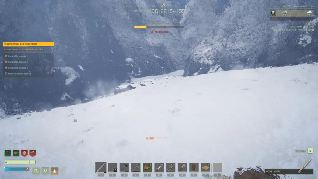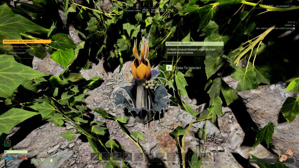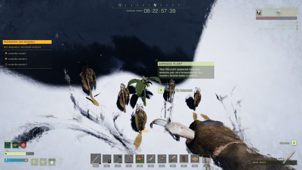 모닥불을 피우고음식을 요리하세요. 보너스 체력과 건강은 나머지 임무를 더 빠르고 안전하게 만듭니다.기다리는 동안 근처 나무를 베어내십시오.나중에 작은 피난처를 만들려면 나무가 필요합니다.목적지에 가까워지면 지나온 호수 바로 북쪽에 있는 큰 바위를 찾으십시오.바위의 남동쪽에 있는 것이 첫 번째 목표입니다. 바위와 상호작용할 수 있을 만큼 가까이 다가가([F] 누르기) 첫 번째 샘플을 수집합니다.