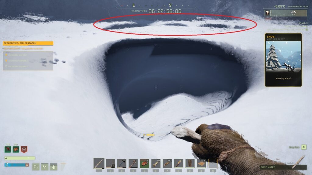 N-14의 오른쪽 하단 모서리에 있는 눈 속 구덩이에서 최종 샘플을 찾을 수있습니다.주의 깊게 접근하지 않으면 쉽게 넘어져 크게 다칠 수 있으므로 주의하십시오.여기에는 여러 개의 구멍이 있습니다.원하는 것은 더 둥근 것 뒤에 더 넓은 것입니다.