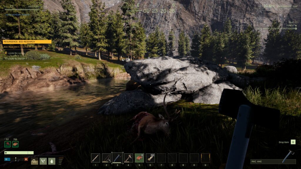 이 다음 생체 샘플은 꽤 평평하기 때문에 찾기가 조금 더 어렵습니다.그것에 도달하기 위해,O-8의 호수 강 될 곳으로 이동하여 강 북쪽의 서쪽 은행을 따릅니다.적당한 크기의 바위 주위를 돌아다니다 보면 이상한 덩굴손이 강으로 들어가는 것을 볼 수 있습니다.바위 뒤에는 두 번째 바이오 샘플을 수집하기 위해 상호 작용할 수 있는 사슴 시체가 있습니다.