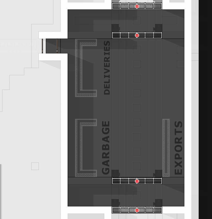 모든 실내 객실뿐만 아니라 배달, 가비지, 저장실도 교도소 설계 시 고려해야 한다.배달은 모든 것이 감옥으로 들어가고 트럭이 음식과 건설 장비, 죄수, 그리고 그 밖의 다른 것들을 포함한 물건들을 내리는 아주 간단하다.쓰레기는 반대로, 트럭으로 수출되기를 기다리는 동안 감옥 쓰레기가 저장되는 곳이다.이 두 방 모두 병목 현상을 방지하고 수입품에 임의의 밀수품[주-대부분의 마약류 및 사치품이 있는 도구]을 포함할 수 있을 뿐만 아니라 죄수들이 도로 구역에 쉽게 접근할 수 없도록 도로 근처에 배치해야 한다.보관 구역은 동일한 방식으로 취급해야 하지만 도로에서 더 멀리 떨어진 곳에 배치할 수 있다.물품은 여유 공간이 있으면 트럭을 통해 배송되기 전에 보관 구역에 발생하며, 분해된 물품은 보관 구역으로 가져가 보관한다.