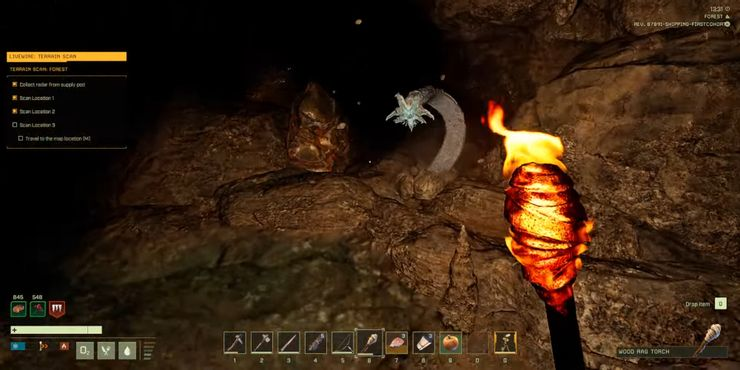 동굴을 밝히려면 횃불을 장비하고 불을 붙이세요. 불이 붙은 횃불을 땅에 떨어뜨리면 불이 켜진 상태로 유지 되어 땅에 작은 광원을 만들 수 있습니다. 이것은 동굴이 매우 어둡거나 밤일 때 유용합니다.