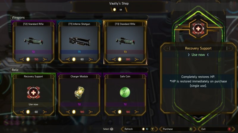 큐브 외에도 기술 을 업그레이드 하거나 새로운 무기를 구입할 수 있는 작은 떠 있는 단일체를 찾을 수 있습니다 . 기술은 또한 행동과 관련이 있습니다. 기본적으로 세 가지 특수 공격(예: 지뢰, 미사일 공격 또는 강력한 베기)과 회피로 구성됩니다. 무기와 같은 스킬은 선택한 캐릭터에 따라 다릅니다. 기본적으로 근접 무기를 전문으로 하는 캐릭터와 원거리 무기를 전문으로 하는 캐릭터가 있습니다.