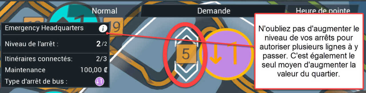 또한 정류장(경로 생성 모드는 아님)과 레벨 옆에 표시되는 +를 클릭하여 정류장의 레벨을 높이는 것을 잊지 마십시오.