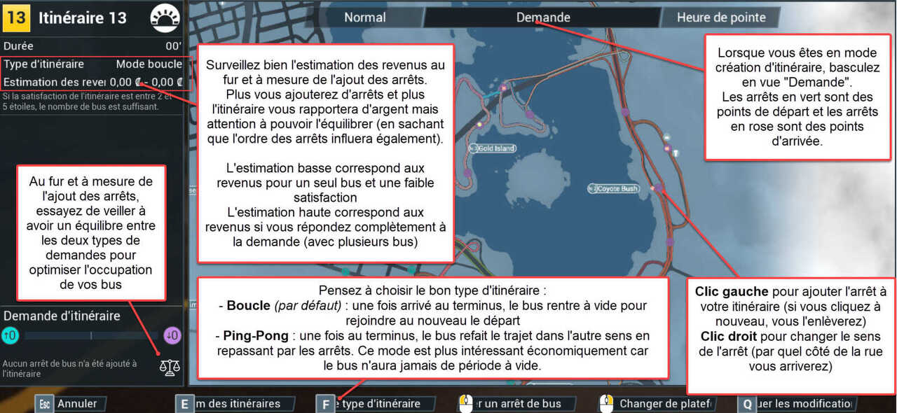 거기에서 시나리오의 요구 사항(특정 구역 또는 정류장 통과, 두 구역 연결 등)을 충족하는 여정을 작성하는 것은 귀하에게 달려 있습니다. 버스 점유율을 최대화하려면 분홍색(하향 승객)과 동일한 수의 녹색 요청(상향 승객)으로 여행의 균형을 유지해야 합니다. 따라서 항상 "요청" 유형 보기를 사용하는 것이 좋습니다.