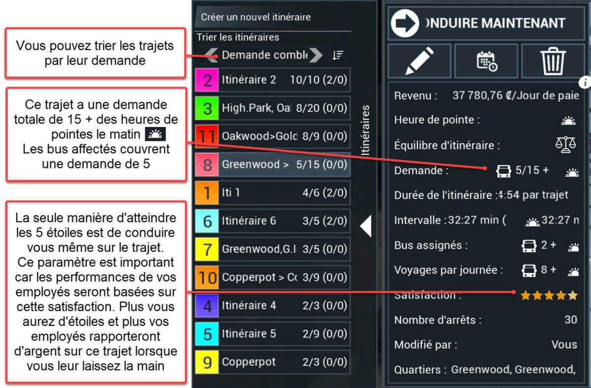 대화형 지도 측면에서 언제든지 각 경로의 요약을 볼 수 있습니다. "요청 처리"를 포함하여 여러 가지 방법으로 정렬할 수 있습니다. 이를 통해 수요를 충족하기 위해 경로에 더 많은 버스가 필요한지 여부를 빠르게 확인할 수 있습니다. 아래의 "Route 6" 경로를 예로 들어 보겠습니다. 귀하의 버스는 5(3/5)의 수요에 대해 3의 응답을 제공하고 피크 시간(2/2) 동안 2의 수요에 대해 2의 응답을 제공합니다. 게임은 여기에 2/0을 표시하지만 이것은 곧 수정될 버그입니다.