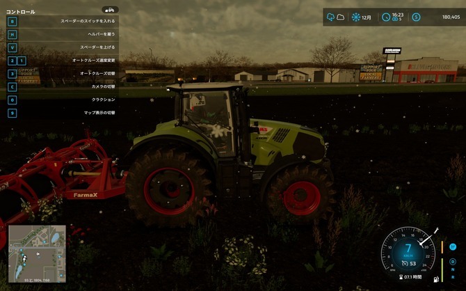 전술한 대로 필자에게는 어느 정도 농업 지식은 있는데, 말할 필요도 없이 게임 미디어의 라이터이기도 하기 때문에, 쓸데없는 자존심에 걸치는 난이도 선택으로는 헤매지 않고 「노멀」을 선택. 그러자 아무런 설명도 없이 거리에 빠져나가게 되었습니다. 화면상의 조작 헬프를 보면서 조속히 토지를 구입해 현지로 향하기로 했습니다만, 다리가 없는 것도 불편이므로 적당하게 돌아다니고 찾아낸 숍에서 픽업 왜건을 구입합니다.