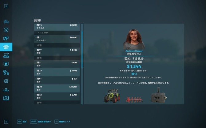 본작에서는, 다른 토지의 소유자는 계약이라고 하는 형태로 아르바이트를 모집하고 있어, 각종 작업을 대행하는 것에서도 돈을 벌 수 있습니다. 이 대행 작업에서는 실제로 필요한 장비를 보상으로부터의 날인이지만, 임대에서 빌릴 수도 있고, 어떻게 장비를 운용하는 것도 공부할 수 있습니다.