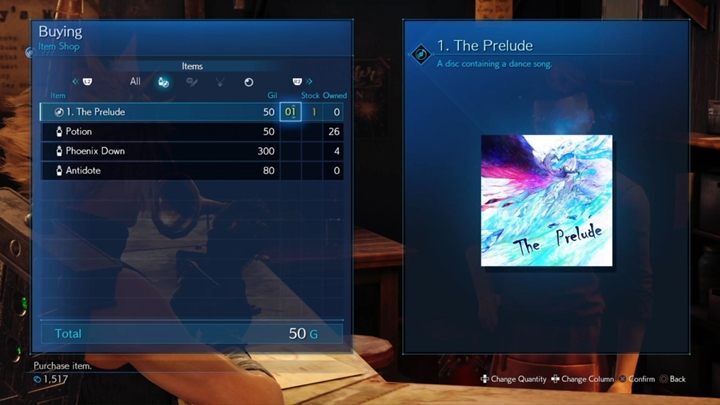 환상이 끝나면 아래층으로 내려가 Marle와 대화하십시오. 티파의 집으로 달려가 그녀에게 말을 걸면 같이 마을로 가게 된다. 첫 번째 상인은 예를 들어 첫 번째 음악 CD 1을 판매합니다. The Prelude. 디스크는 숨겨진 음악 수집품으로 주크박스 머신에서 재생할 수 있습니다. 그들의 목록은 가이드의 별도 장에서 찾을 수 있습니다.