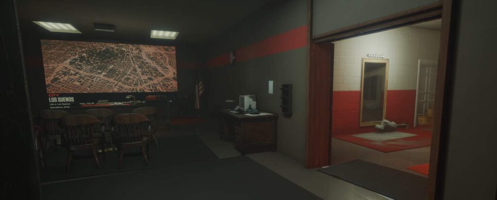습격 임무를 선택하려면 방 전면에 있는 지휘관의 책상에 접근하여 임무 선택기를 엽니다. 이 선택기 안에는 8개의 개별 위치 중에서 선택할 수 있습니다. 8개 위치 중 6개는 Ready or Not 세계에서 경험할 수 있는 개발 위치입니다.