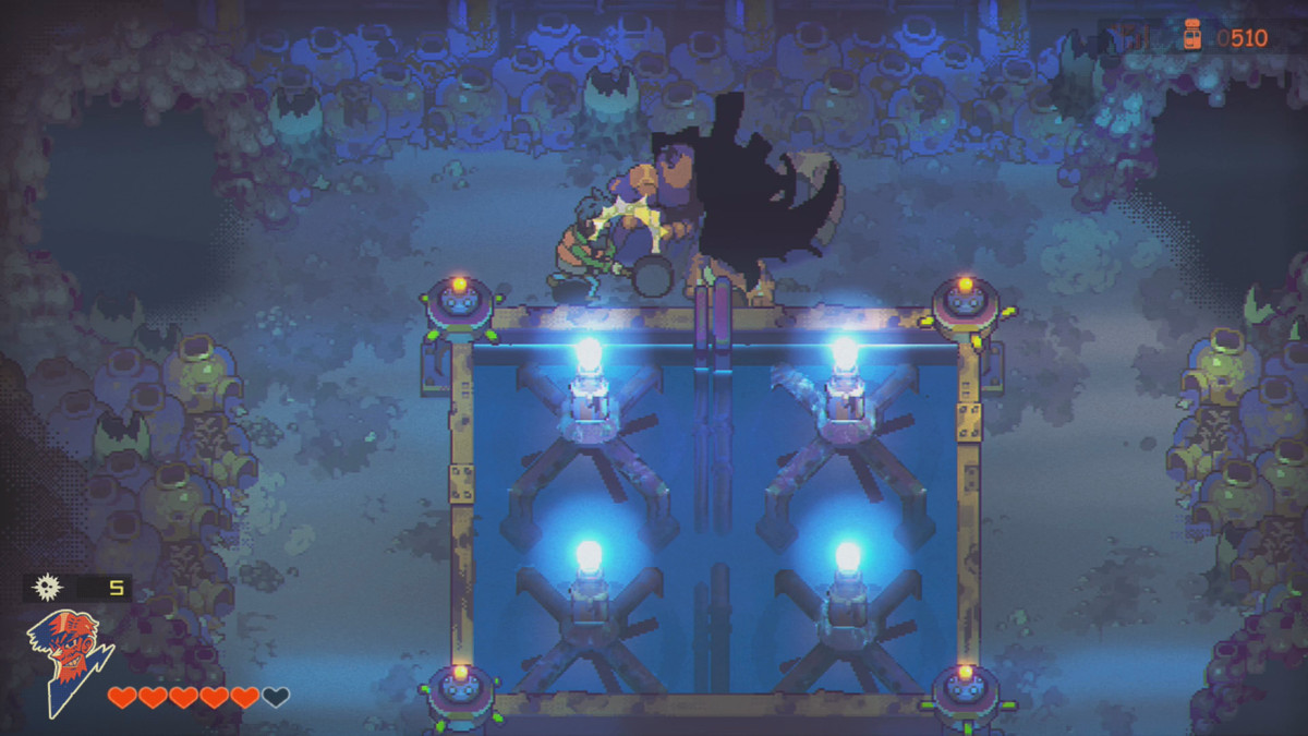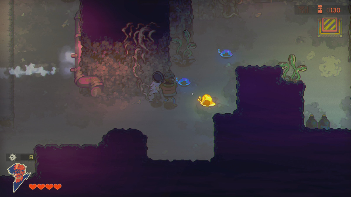 게 같은 두 번째 보스를 물리치려면 화면 중앙 근처에 위치한 펜 가장자리에 있는 4개의 기둥을 활성화해야 합니다. 이렇게 하면 벽을 따라 있는 각 구멍에서 증기 제트가 생성됩니다. 보스가 그 구멍 중 하나 내부 또는 근처에 있으면 열로 인해 일시적으로 무력화되고 안전하게 이동하여 약간의 피해를 줄 수 있습니다.