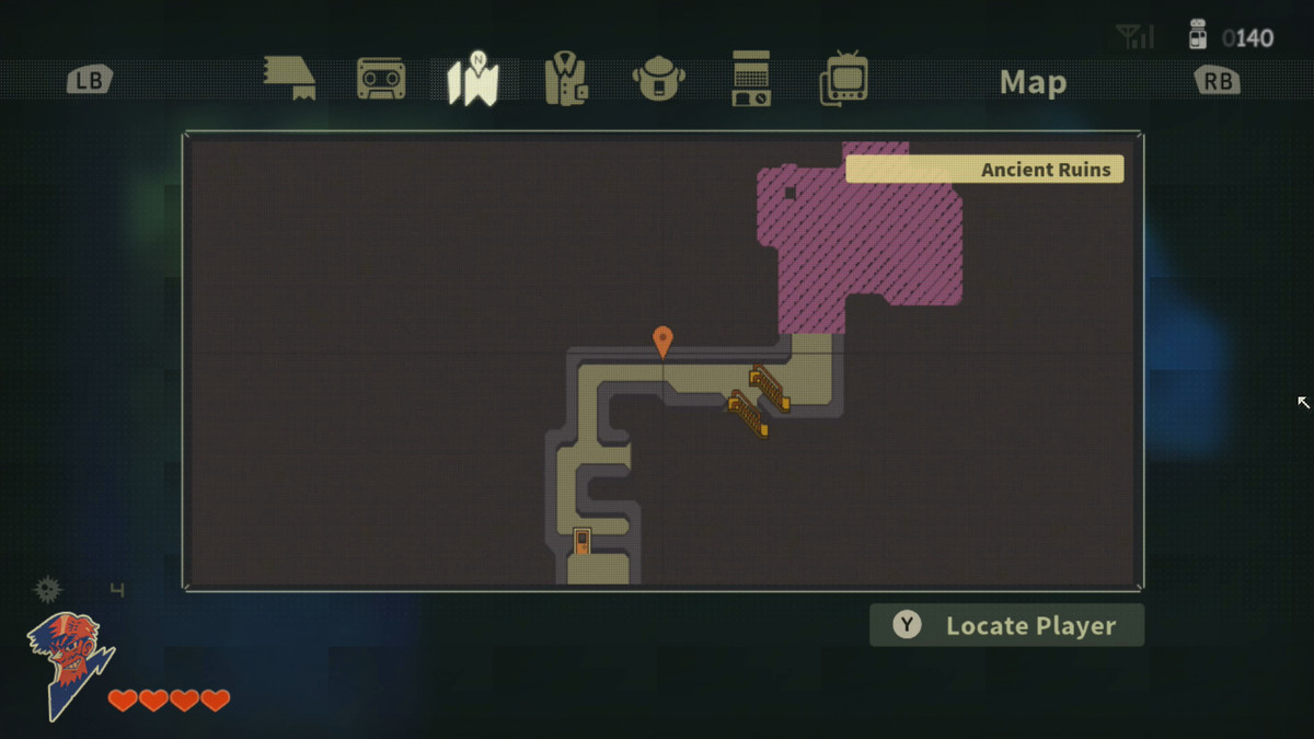 Eastward 를 일시 중지하면 장비를 변경하고, 일지를 보고(현재 목표가 무엇인지 알 수 있음) 지도를 참조할 수 있는 여러 탭에 액세스할 수 있습니다. 지도는 매우 유용하며 탐색할 때 자동으로 채워집니다. 일부 미로 같은 환경은 처음에는 어려움을 겪을 수 있지만 게임 내 지도를 사용하면 이미 있었던 위치를 확인하고 다음 목표를 가리킬 수 있습니다.