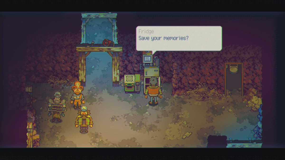 던전이나 그 던전 내의 보스 챔버와 같이 특히 위험한 영역에 들어가기 전에 텔레비전이 놓여 있는 냉장고를 종종 발견할 수 있습니다. 냉장고를 조사하여 비밀 메시지를 받고 진행 상황을 저장하십시오. Eastward를 사용하면 던전을 탐험할 때 특정 체크포인트에서 자동으로 재개할 수 있습니다. 그러나 하루 동안 놀지 않으려면 가장 가까운 냉장고에 저장하는 것이 가장 좋습니다.