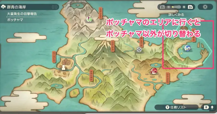 대량 발생이 발생하면 맵에 대상 포켓몬 아이콘이 표시됩니다. 에리어 마다의 맵에서는 상세한 장소를 알 수 있으므로, 아이콘의 장소를 목표로 해 가면 대량 발생중의 포켓몬을 만날 수 있다.