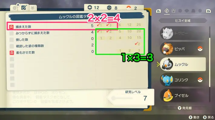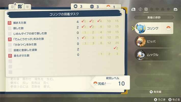 포켓몬마다 다른 도감 작업을 클리어하면 연구 수준이 최대 10까지 올라간다. 태스크는 잡은 수나 쓰러뜨린 수, 특정의 일부를 본 횟수 등 다양하다.