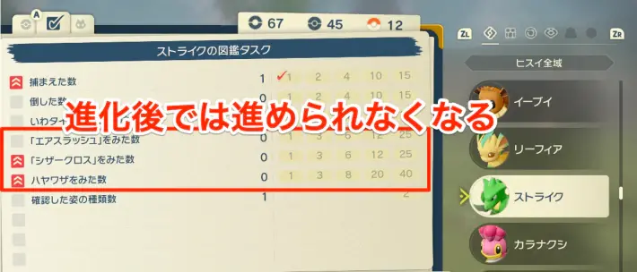포켓몬을 진화시키면 진화 후의 포켓몬의 도감 태스크가 적용되어 진화 전의 「속담을 본다」등의 태스크가 묻히지 않게 된다. 진화 전을 많이 포획하고 있지 않은 경우, 진화 전 포켓몬의 태스크를 메우고 나서 진화시키는 것이 추천.