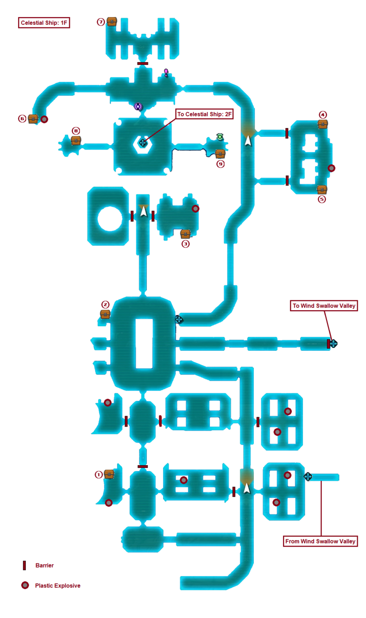 Celestial Ship 내부에는 연결된 일련의 방과 복도가 있습니다.많은 문들이 봉인되어 있지만곳곳에서 찾을 수 있는플라스틱 폭발물 로 문을 파괴할 수 있습니다.내부에 반짝이는 점이 있는 빛나는 구체를 찾으십시오.봉인된 문을 통과하려면 그것을 조사하고 폭발물을 설치합니다.그런 다음Fire Ring 을 사용하십시오.폭발물을 터뜨리기 위해.폭발로 인한 부상을 피하기 위해 장약을 넣은 후 멀리 이동하십시오.일부 문에는 전하, 날아가는 스파크 등이 있어 폭발을 일으킬 수 있으므로 Fire Ring을 사용할 필요가 없습니다.모든 봉인을 제거하기에 충분한 플라스틱 폭발물이 있지만, 하나를 잃어버리거나 충전을 잘못 배치한 경우 배를 떠나면 수집한 폭발물이 다시 나타납니다.배를 통과하기 위해 모든 인장을 파괴할 필요는 없지만 파괴할 때마다 경험치와 파티 SP를 얻을 수 있습니다.