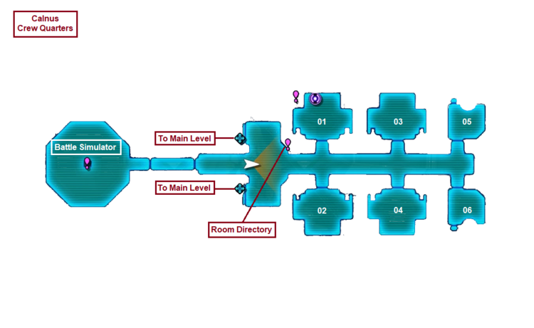 Edge의 문제를 해결했으면 Battle Simulator를 종료하여 USTA 수송선 SRF-003 Calnus의 상위 레벨에 있는 자신을 찾으십시오.왼쪽과 오른쪽에는 배의 메인 레벨로 내려가는 계단이 있습니다.앞의 복도는 승무원 숙소로 이어집니다.왼쪽의 각진 벽에는 룸 디렉토리가 있습니다.Edge는 왼쪽의 첫 번째 방인 01호실에 있습니다.내부에는 쉴 수 있는 침대와 세이브 포인트가 있습니다.
