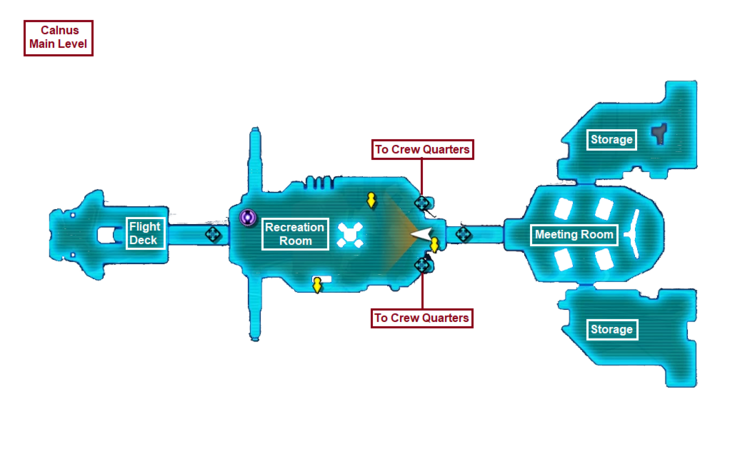 배의 메인 레벨로 가는 계단을 내려가십시오.당신은 오락실에 나타납니다.여기에 또 다른 세이브 포인트가 있고 그 너머에는 비행 데크가 있습니다.Flight Deck로 이동하기 전에 레벨 반대편에 있는 Meeting room에 입장하십시오.맨 끝에는 지금 작동하지 않는 컴퓨터 콘솔이 있습니다.회의실의 긴 측면에 있는 문은 보관실로 연결됩니다.지도 상단의 창고로 들어가 창고를 조사하여Weapon Data 122:SRF-Issue F98 Assault Rifle가 포함된 데이터 파일을 찾으십시오 .