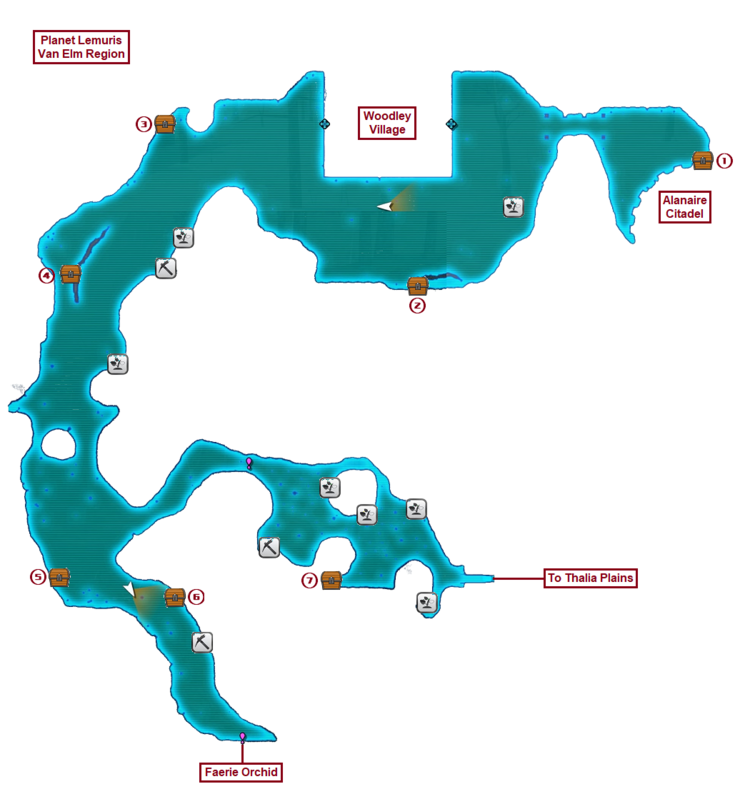 다시 Triom Village에 도달하려면 Van Elm 지역을 통해 남쪽으로 이동한 다음 Silent Forest를 통해 동쪽으로 이동해야 합니다.고요한 숲을 통과하는 통로는 요정 난초가 없으면 차단됩니다.이지스 호수 기슭의 반느릅나무 지역 남단에서 요정 난초를 찾을 수 있습니다.그 위치는 지도에 관심 지점으로 표시됩니다.