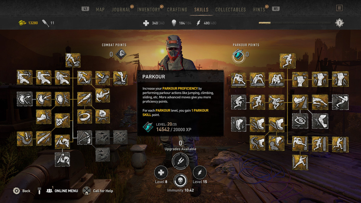 대체로 전투 기술은 감염(좀비) 및 배신자와 같은 적에게 피해를 입히는 새로운 방법에 관한 것이고 파쿠르 기술은 도시를 뛰어다니는 능력을 향상시키는 것입니다.