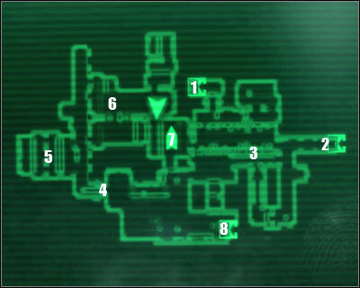 지도 범례: 1 - 시작 지역 및 출구: Vault 101; 2 - 경비원 및 출구: Vault 101 - 입구; 3 - 남쪽 문; 4 - 관리실; 5 - 아마타와 감독관; 6 - 조나스의 시체; 7 - 감독관 터미널; 8 - 출구: Vault 101 - 입구