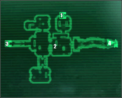 지도 범례: 1 - 시작 지역 및 출구: Vault 101 - 아트리움; 2 - 제어판; 3 - 출구: Vault 101 - 아트리움; 4 - 금고의 주요 출구